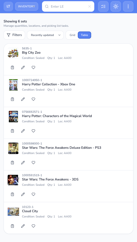 Create storage objects, print labels, and assign sets to any level - room, shelf, or box.